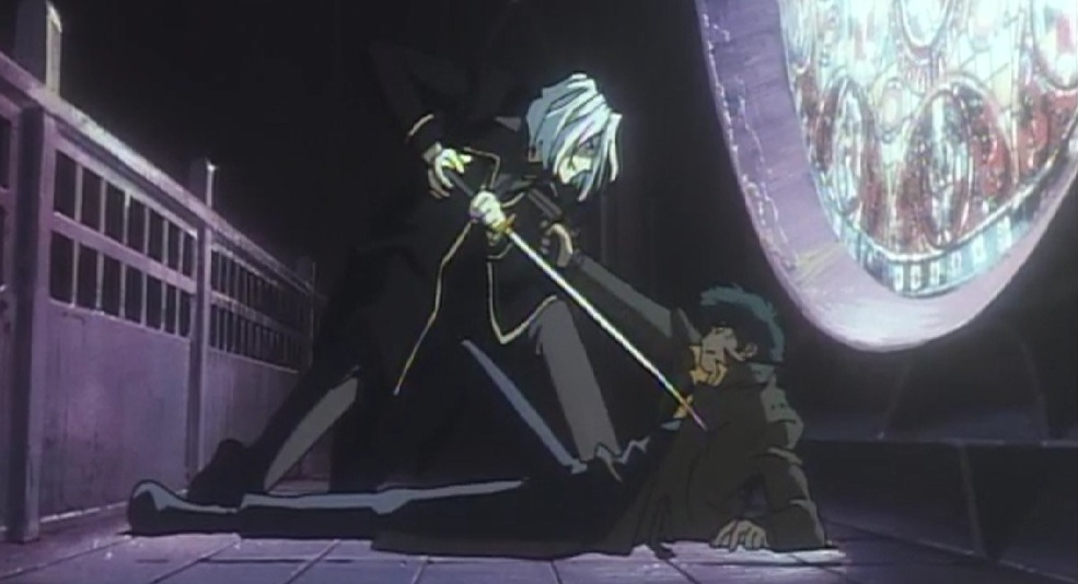 Bebop’s fifth episode opens as Mao Yenrai, capo of the Red Dragons, is betrayed moments after signing a peace treaty with the head of a rival syndicate. Their contract, sworn in blood, was rendered void as the new allies ship exploded on takeoff and Yenrai’s own guard lies in pools of their own blood. The silver haired man steps over their corpses. Yenrai pleads with him that the violence has to end for the syndicate to survive. His pleas end as the blade slides from under his chin and his blood hits the floor. Yenrai gasps ‘If Spike were here, you would never have done this.’ An impossibly large smile breaks across the silver haired man’s face.